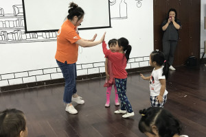 小朋友们围坐成半圆,老师以用唱跳,匹配脚丫子的方式围绕“foot”展开活动,“left foot”、“right foot”、“two feet”…学完今天的词汇后,老师还邀请小朋友们涂制属于自己的彩色风筝,现场气氛十分活跃。