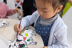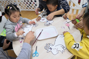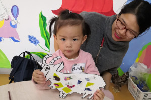 绘本分享后,孩子们观察模型母鸡,一种头小、眼睛椭圆、嘴尖且硬、毛多而密又长的家禽。然后进入手工环节:首先分发布料、剪刀、山羊模型,给山羊做一件破破烂烂的衣服;接着分发滚筒刷、绿色颜料、卡纸,画上绿绿的草地,最后将山羊放到绿绿的草地上。