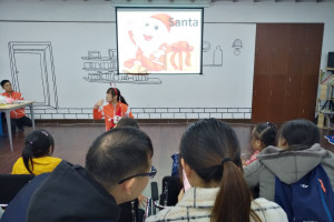 活动开始,老师一边讲解故事内容,一边配以欢快的圣诞乐曲。小朋友们都积极地参与了进来,跟着老师重复说着一些单词、词组,“Santa”, “red suit ”, “Merry Christmas”……最后家长和孩子起制作圣诞主题存钱罐。