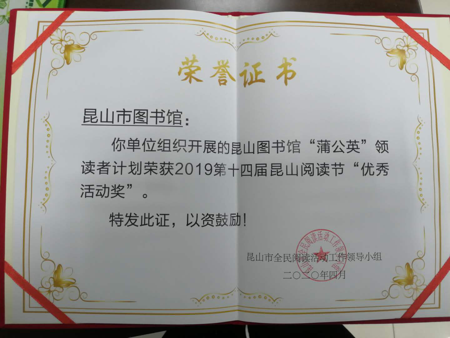 在评选中,昆山市图书馆荣获2019年度昆山市全民阅读先进单位,组织开展的“蒲公英”领读者计划荣获“优秀活动奖”,李青荣获昆山市全民阅读先进个人。