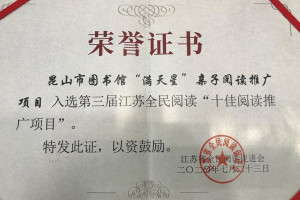 在7月23日上午举行的第十届江苏书展开幕式上,江苏省全民阅读促进会表彰了第三届江苏全民阅读十佳阅读推广项目,昆山市图书馆“满天星”亲子阅读推广项目榜上有名。