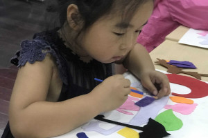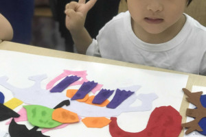 绘本分享后老师准备了动物们的图片,并按照颜色的顺序依次认知各种动物,并重点介绍动物特征。老师给出颜色引导词,小朋友按照颜色顺序将图片拍成一排;分发A3白色硬卡,将动物图片们粘贴固定在硬卡的上方或下方,最后老师为大家准备了不织布粘贴材料包,给足够的时间让小朋友们拼装成变色龙,将拼装好的混合变色龙固定到硬卡中间;完成作品后,他们为自己拥有一张拼拼凑凑的变色龙而开心。