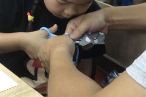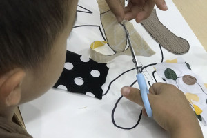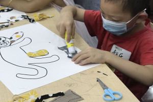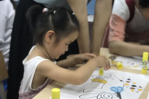 绘本分享后老师给每个小朋友准了用脸盆装的水,引导小朋友观察水中的自己和灯光,并用问题引出孩子们的观察方向:“你们能看清水中的自己吗?”“水中的自己是清楚的还是模糊的?”让小朋友了解光的折射现像。绘制时间分发猫各个部位在不同动物眼中的色彩的布料,再分发有猫的模版的A3白色硬卡,剪刀,胶棒,将猫的不同部位对应的色彩的布料,剪好,粘贴完成,最后呈现出每个不同动物眼中的不同的猫的样子。小朋友会一起和爸爸妈妈分享自自己的作品。