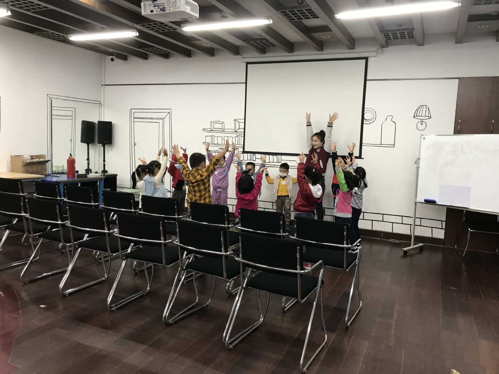 活动开始后,老师带领小朋友们在充满欢快,动感的音乐中进行热身后再开始绘本分享。