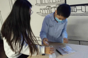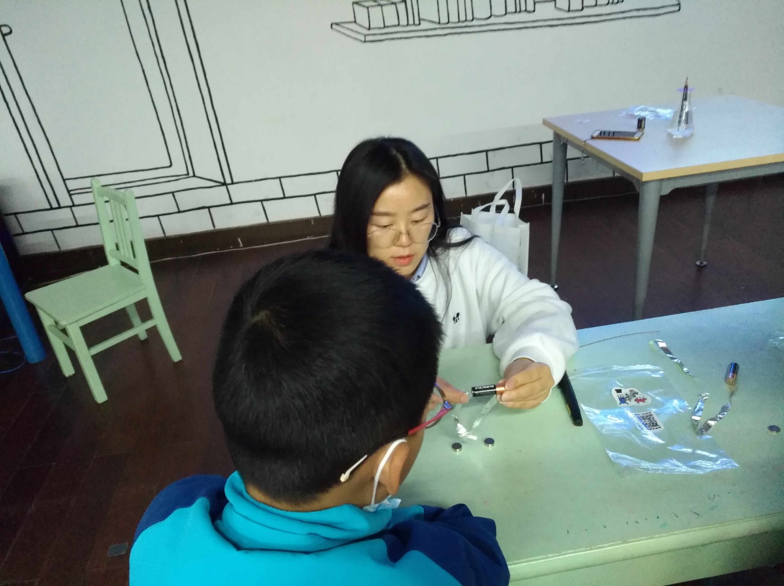 接下来小读者们拿到材料包准备制作锡纸秋千,当锡纸两端与电池正负极相触,此时有电流通过锡纸,形成一个磁场,与桌面上磁铁发出的磁场呼应,锡纸被推高,当锡纸与电池断开连接时,磁场消失,锡纸又落了下来,如此循环,就形成了荡秋千的效果,小读者们大获成功,高兴不已,纷纷向老师展示自己的锡纸秋千,还要比一比谁的秋千荡的最高。