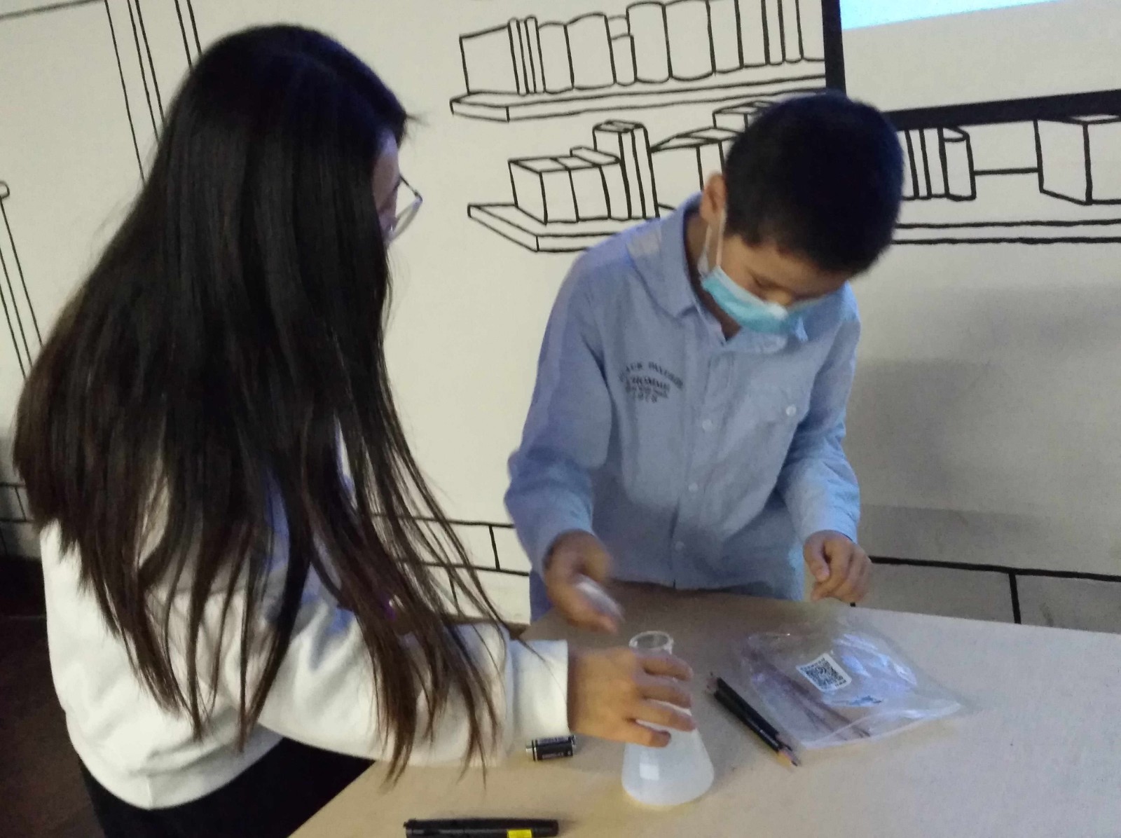 第一个实验是电解水,由于实验会产生部分易燃气体——氢气,因此仅由老师在台上进行操作演示,并随机邀请小读者们上前观察实验现象。实验中老师在水中加入小苏打来提高导电性,并由此引入知识点,向小读者们普及了生活中常见的导电体及水能导电却不是导体的原因。