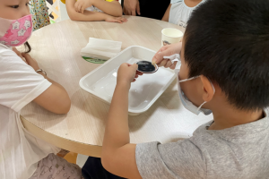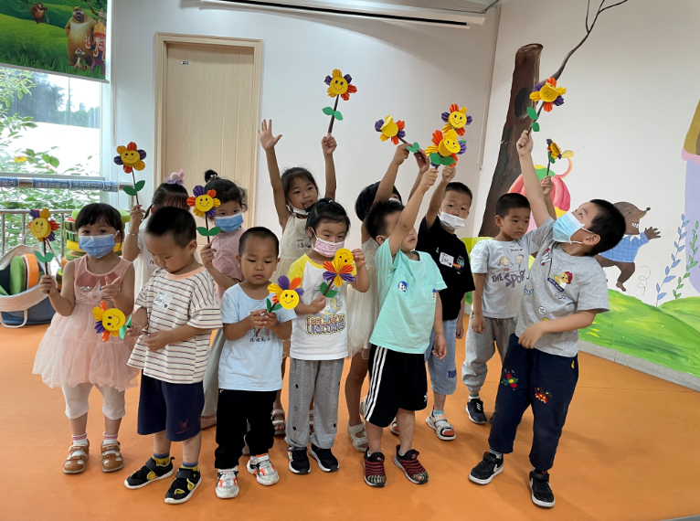 绘本分享后让小朋友一起完成跃动的祝福实验,让小朋友了解白板笔漂浮字的原理。白板笔的墨水中添加了降低附着力的“剥离剂”。墨水凝固后形成一层薄薄的粘膜,极易与玻璃等光滑表面分离。因为墨水的密度比水小,图案就漂浮在水面啦。在老师的指导下,小朋友们自己制作了一幅属于教师节的礼物,并给家长展示自己的作品,让小朋友表达尊师重教的情感。