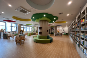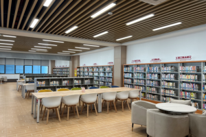 图书馆内设有少儿借阅区、成人借阅区、报刊阅览区,阅览座位100余个;配备2台自助借还机,10台电脑用于电子阅览功能,成人阅览室配备软沙发,增加阅读舒适感,阅读座位增加照明、多功能插座等功能,馆内还设有千兆免费wifi。