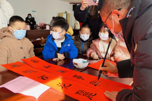 在活动现场,昆山昆仑堂美术馆书法家沈江、周庄小学学生陆晨翌以及周庄书法家沈维荣、金利华等挥毫泼墨,为在场的家庭写春联、写“福”字。期间,书法家们还与小朋友们互动交流,给他们讲述对联的意思。