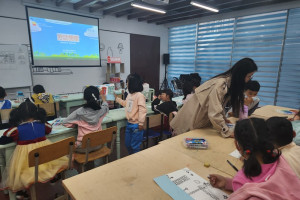 老师通过PPT带小朋友们了解劳动者的工作环境,之后再运用自己的画笔表现出劳动者建设城市的状态。