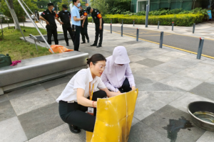 在消防知识讲座结束后,图书馆还组织了2023年上半年度的消防安全演练。演练分为消防逃生疏散演练、灭火毯使用规范、灭火实操练习三个环节,馆员根据工作职责和演练方案各司其职,圆满地完成了演练工作。