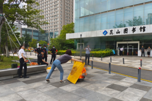 疏散演练结束后进行了灭火毯的使用培训。在由姜顾问讲解完消防器材的使用方法后,馆员们按照灭火流程使用灭火毯对训练用火源进行扑灭,完成了灭火毯使用培训。