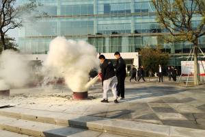疏散演练结束后进行了灭火实操练习。在由姜顾问讲解完灭火器的使用方法和注意事项后,新员工按照操作流程使用灭火器对训练用火源进行喷射,完成灭火任务,熟练掌握了灭火器材的使用方法。