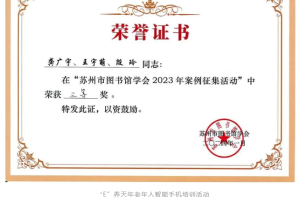 在项目实施中,昆山市图书馆与区镇分馆合作形成常态化开展机制,将活动输送到社区、分馆等更基层的地方去,惠及更多更基层的老年人。2021年,在炎武社区开展的“E养天年”老年人智能手机培训活动荣获昆山市全民阅读活动工作领导小组颁发的第十六届昆山阅读节“优秀活动奖”。此外,昆山市图书馆深耕课程体系建设,研究探索适合昆山老年群体的数字素养教育模式,并以城乡融合老年人数字素养教育为主题先后于2021年、2023年申报了苏州图书馆学会、中国图书馆学会课题,收获了良好的研究和实践结果。