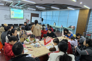 手工环节:用卡纸、胶棒和彩笔绘制一幅图画来演练有人敲门时,在家的小朋友们该怎么办呢?孩子们在家人的陪伴下一边制作,一边回顾着故事内容。