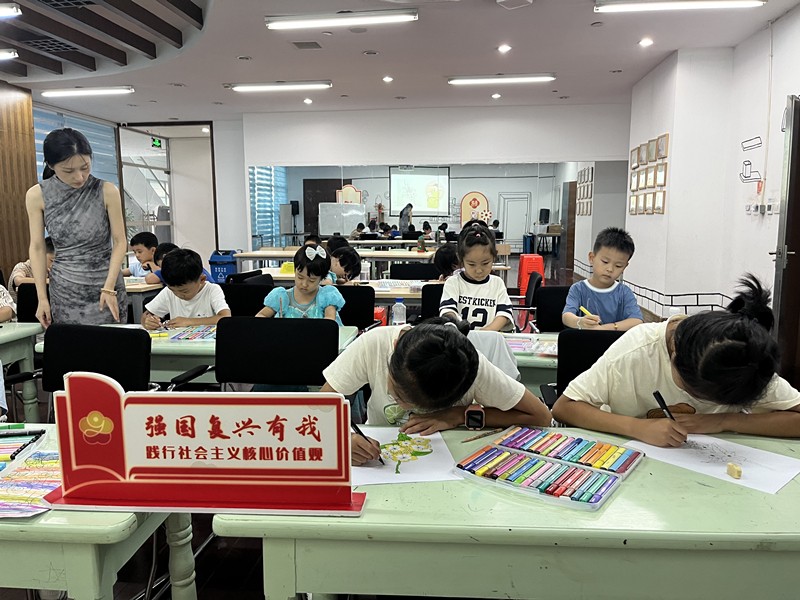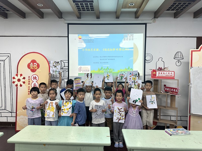 2025年8月24日14:00,小书虫俱乐部在昆山市图书馆一楼大厅读书乐基地,举办了一场精彩的小书虫艺术课《琼花如梦•吹墨花开》。