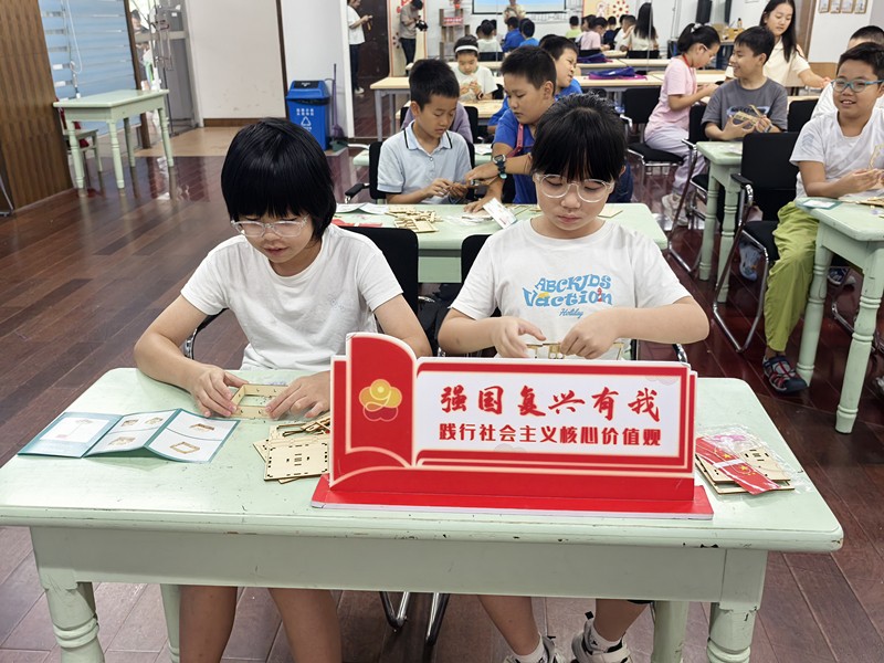 手工实验环节,需要小读者们自制升国旗模型。在老师的指导下,他们认真地组装着旗杆、底座、滑轮、国旗等部件,一个个精致的升国旗模型在他们的手中逐渐成型。大家在动手中学习,在实践中思考,对升国旗有了更直观的理解。