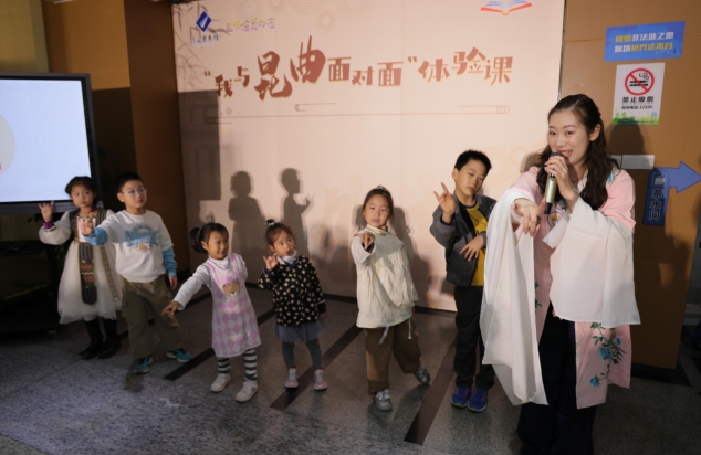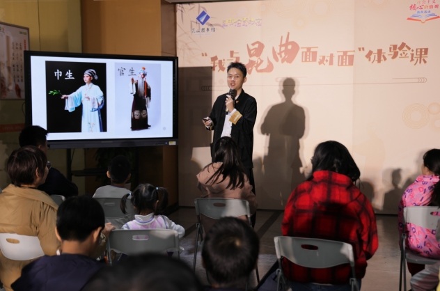 “我与昆曲面对面”活动则邀请昆山当代昆剧院的老师讲解昆曲的基础知识,现场的小朋友还兴致勃勃低跟着专业演员学习昆曲的动作。现场特别设置了昆曲主题书架,展示《大美昆曲》《于丹·游园惊梦》等相关书籍,营造出浓厚的戏曲文化氛围。
