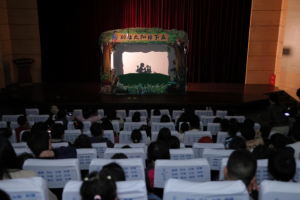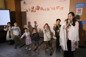 在二楼报告厅里面座位虚席,上演的皮影戏《别让太阳掉下来》,改编自朱成梁的原创图画书,讲述了一个“从天而降”的故事。浓厚的民间艺术中国风,让观众在光影交错中领略传统艺术的魅力。
