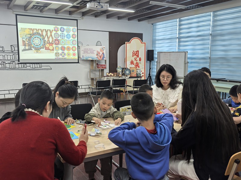 绘本共读结束后,便进入了充满创意的藻井画手工环节。敦煌藻井作为莫高窟洞窟顶部的装饰艺术,以其对称的构图、华丽的色彩,被誉为“敦煌艺术的眼睛”,既蕴含着古人对天空的敬畏,也展现了极致的美学追求。小朋友们在家人的陪伴下,立刻化身“小小艺术家”一边制作,一边回顾故事内容。