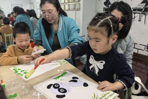 在创意拼贴画环节,小朋友们运用黑色、白色不织布,精心贴出各具特色的大熊猫。通过拼贴创作,小朋友们不仅锻炼了手眼协调能力,更将对熊猫的喜爱与理解融入作品之中。