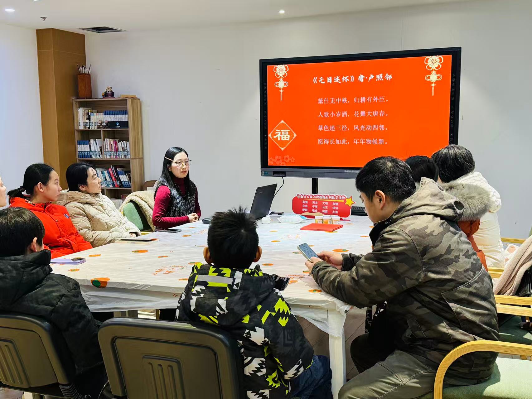 活动开始,老师带领大家学习了和新年有关的诗词。从“新来特特更门地。都收拾、山和水”的除旧布新,到“愿得长如此,年年物候新”的喜庆期盼;从“共欢新故岁,迎送一宵中”的团圆守岁,到“花开花落情未老,年复一年志亦坚”的励志自勉,一首首经典诗词不仅勾勒出古时丰富多彩的过年景象,也传递了新春文化中蕴含的团圆、祈福、希冀等永恒主题。不管过去还是现在,盼团圆、求平安、希望一年比一年好的心情,都是一样的。