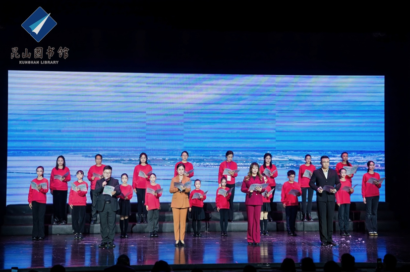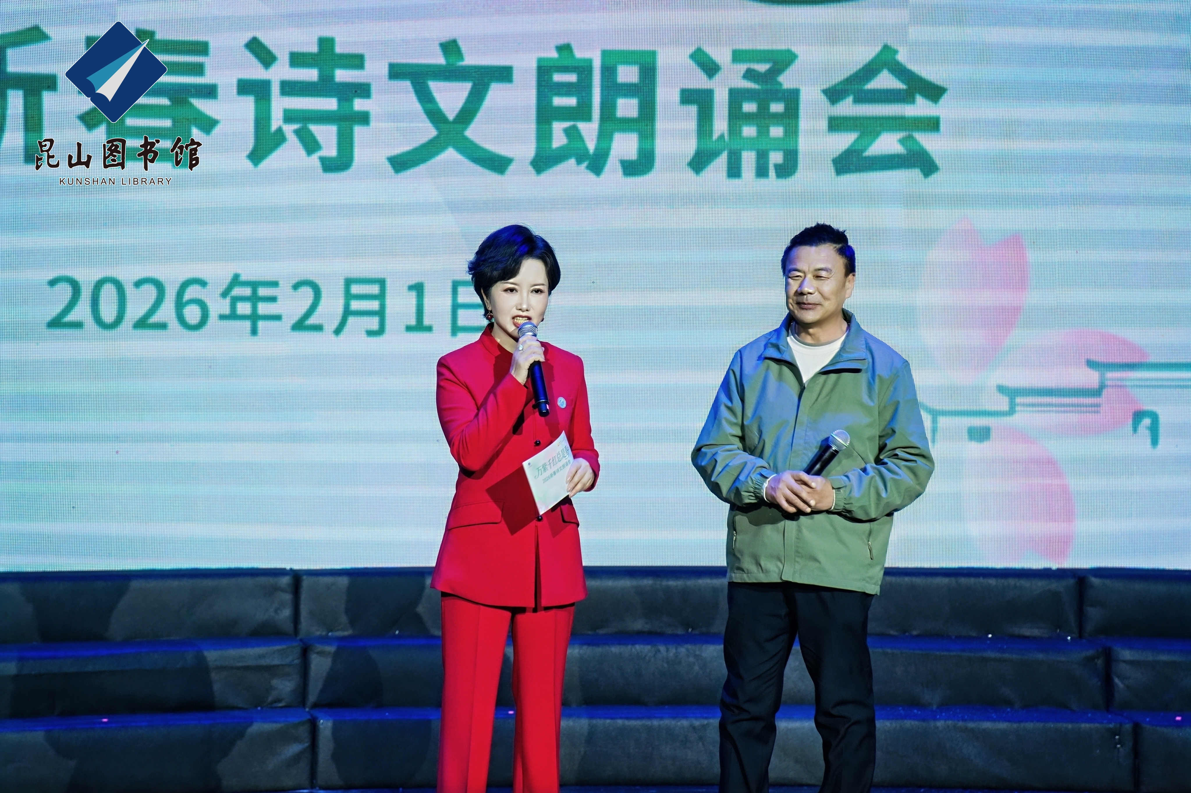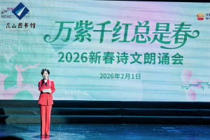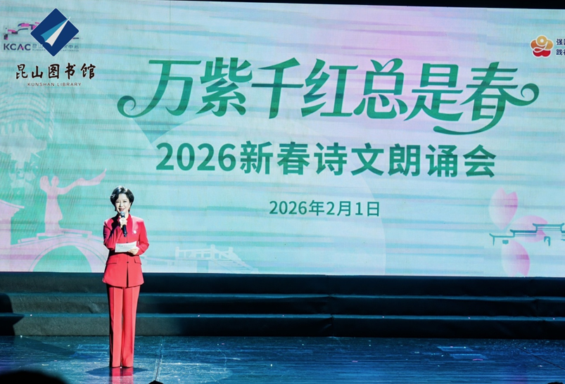 策马迎春,阅享新年。2月1日晚,恰逢《全民阅读促进条例》正式施行,“万紫千红总是春——2026新春诗文朗诵会”在昆山文化艺术中心举行。活动由昆山市文体广电和旅游局、江苏省朗诵协会共同指导,昆山市图书馆主办。朗诵会以诗意盎然的艺术形式,为广大市民献上了一场融合经典与现代、贯通人文与科技的新春文化盛宴。昆山市文体广电和旅游局党组副书记、副局长郁新,昆山市社科联主席顾彩芳,昆山市文联副主席、中国作协会员、“外卖诗人”王计兵等领导和新就业群体代表、朗诵爱好者们观看了演出。