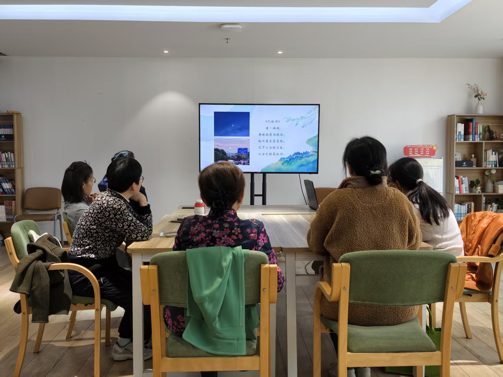 活动现场,馆员老师围绕历代描写扬州的经典诗词展开细致讲解,以李白千古名句“烟花三月下扬州”为切入点,结合扬州古称“广陵”的历史背景,梳理了不同朝代文人笔下的扬州人文风貌,带领在场读者读懂诗词文字背后的城市底蕴与文化内涵。讲解过程中,馆员逐一解读经典诗词内容,详细讲解各类诗词的创作背景、核心主旨,重点分享了杜牧、徐凝、姜夔等历代文人的扬州题材经典作品。现场读者全程认真聆听、静心学习,跟随着主讲人的思路,沉浸式感受古典诗词的独特魅力与扬州古城的深厚文脉。整场活动节奏舒缓、氛围轻松融洽,真正实现了以诗会友、互助学习的活动初衷。