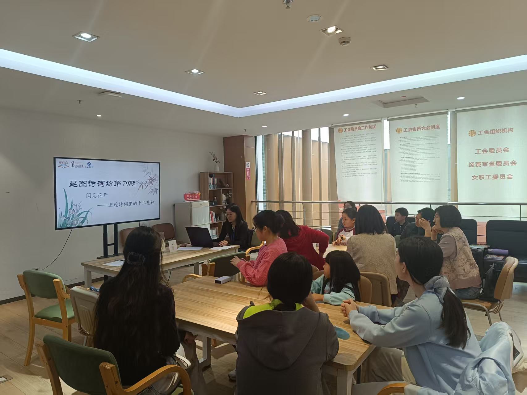 2026年4月25日下午,昆图诗词坊第79期活动在昆山市图书馆五楼交流室顺利开展。本次活动共有15位读者参与,活动通过讲解花神典故、品读诗词等环节,带领读者领略中华传统文化中的“一花一诗一风骨”,感受春日赏花与品诗的双重雅趣。